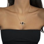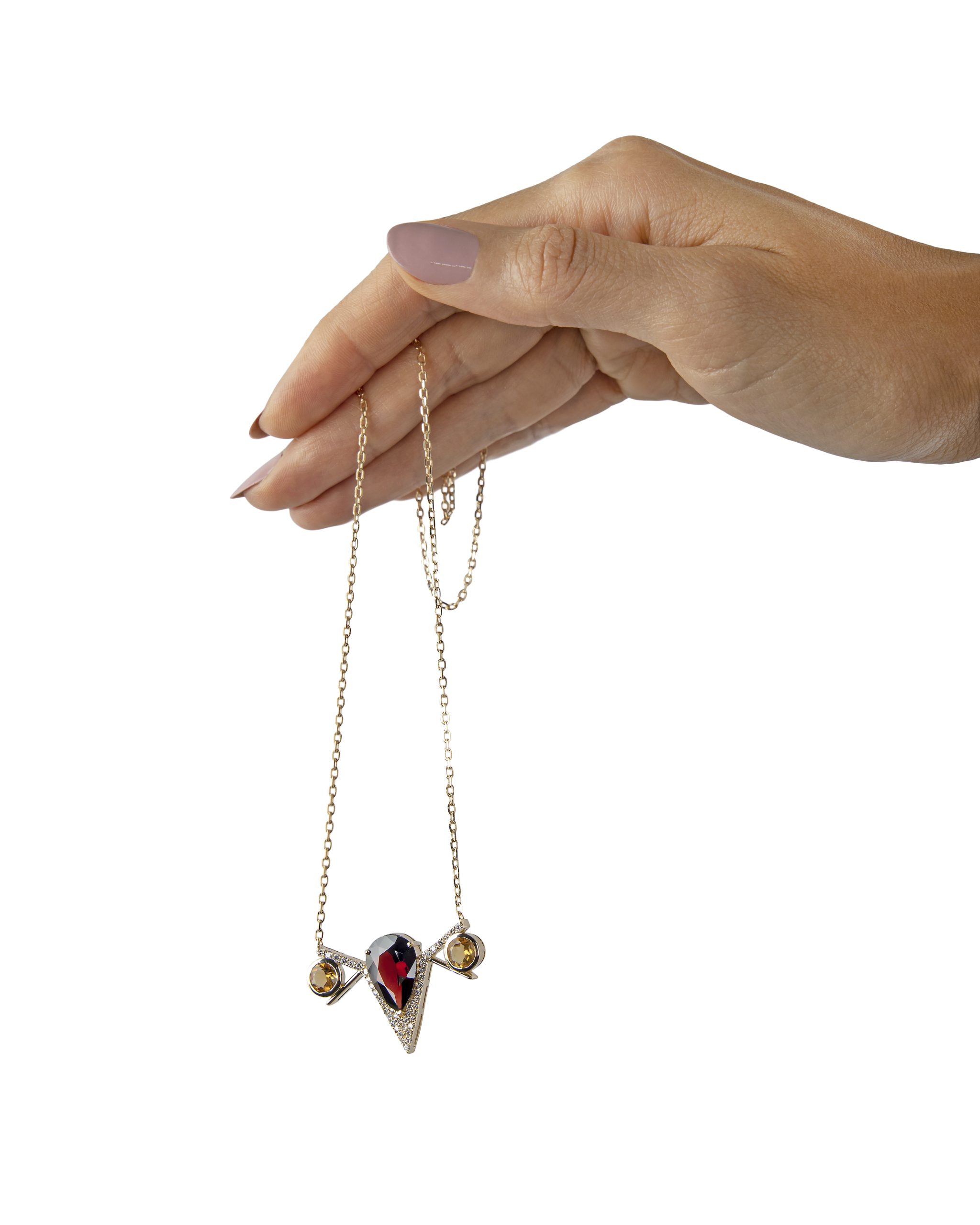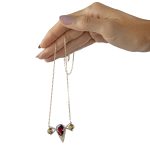With its V shaped diamond setting and rich red garnet stone, Bubo-V necklace evokes the elusive shape of an owl.