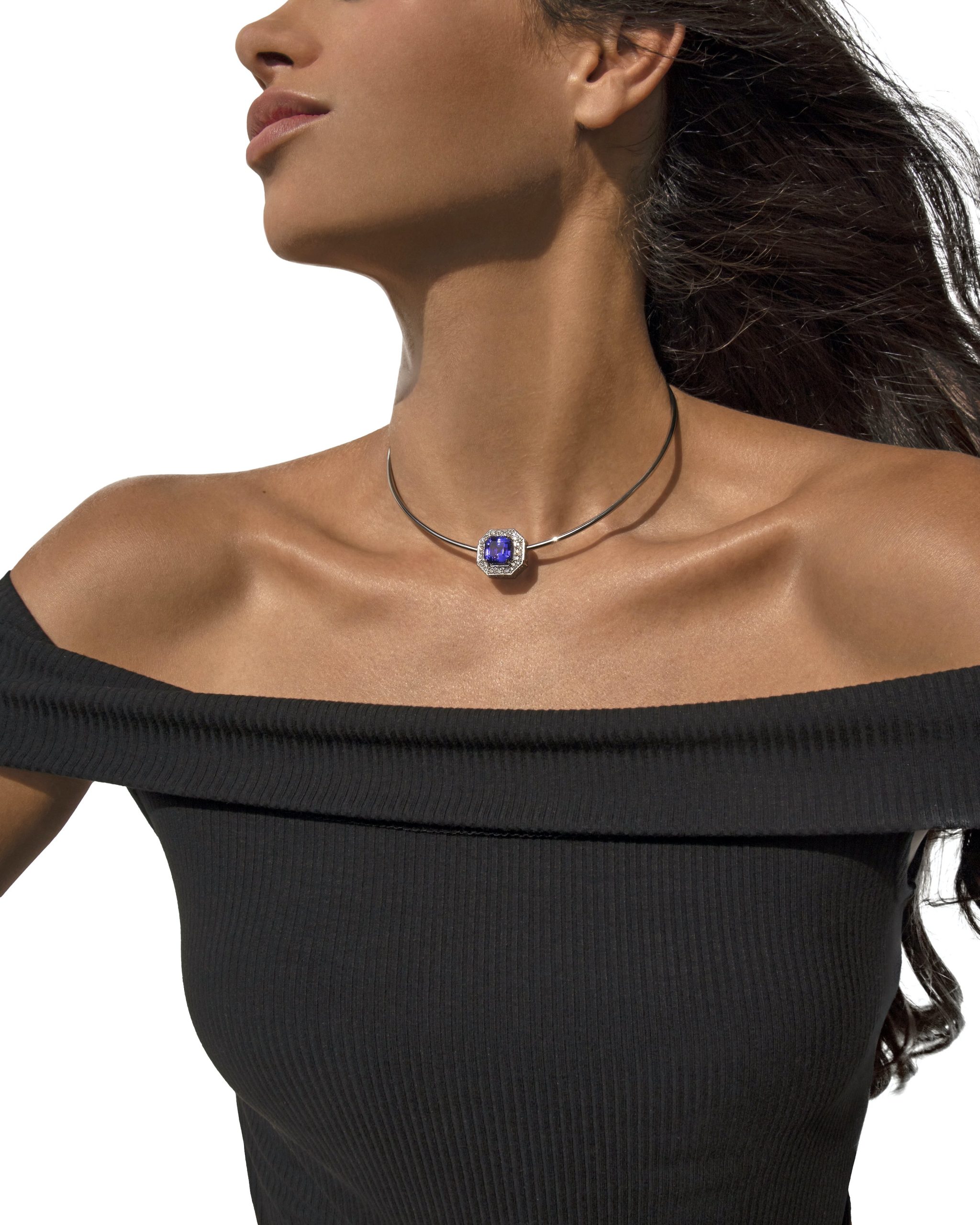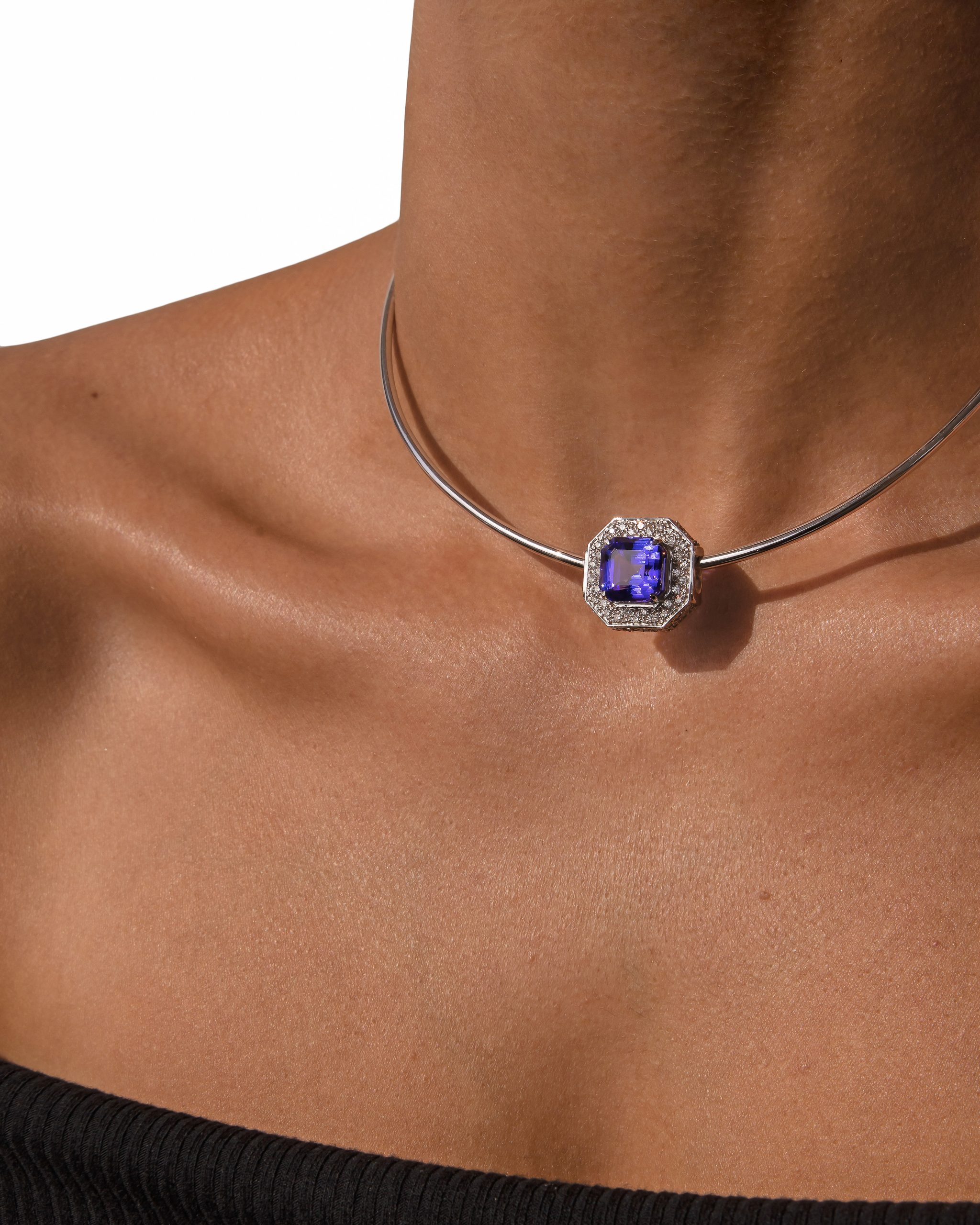 Like a bold architect or artist with a vision, with the Casablanca coil necklace you can create a piece that matches your exact energy and style. We’ll hand-select diamonds and gems (either modified Asscher cut blue tanzanite to go with white gold, modified Asscher cut pink for rose gold or amber cut pink and champagne tourmaline for yellow gold) and encase them in brilliant cut diamond. The seamless opening and closing just adds to the wonderful originality of the piece.